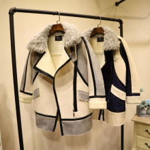 2016女装新品冬装加厚保暖毛呢外套时尚鹿皮绒拼接羊羔毛大衣开衫