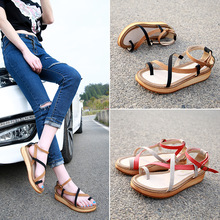 MOMIK2017夏季韩版露趾平底搭扣大码女鞋罗马真皮厚底松糕凉鞋潮