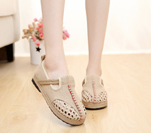 夏季亚麻纯手工编织民族风布鞋镂空透气一脚蹬平跟厚底休闲女单鞋