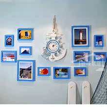 新晴地中海风格装饰挂钟照片墙 海洋风情蓝色相框墙相框组合包邮