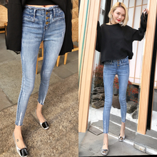 17春夏新排扣高腰牛仔裤女显瘦浅蓝色九分毛边铅笔小脚裤修身弹力