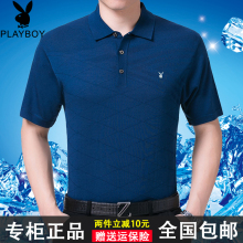 男士短袖t恤桑蚕丝中年男装polo衫条纹花花公子半袖翻领男爸爸装