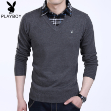 花花公子长袖t恤男士韩版修身薄款体恤青年假两件上衣针织衫潮流