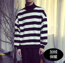 韩国原宿BF风ulzzang宽松高领套头条纹卫衣情侣装韩版外套潮 男女
