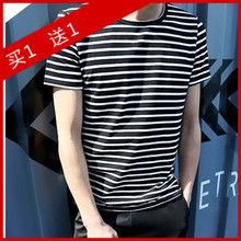日系拼色条纹圆领休闲T恤 夏装新款韩版修身t恤男生短袖潮 林弯弯