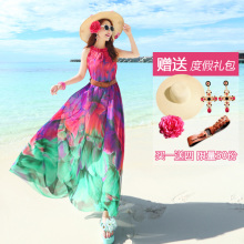 2017沙滩裙夏长裙渐变印花雪纺大码显瘦连衣裙波西米亚海边度假裙