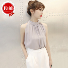 韩版性感露背挂脖立领 无袖背心露肩衬衫上衣 垂坠雪纺衬衫 女