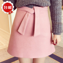 冬季韩版新款加厚毛呢纯色蝴蝶结A字裙高腰系带显瘦包臀半身短裙