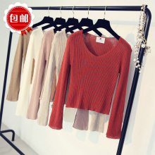 Tracy早春款韩春夏慵懒小女人大V领露肩长袖喇叭袖毛衣针织衫上衣