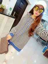 2017新款女装韩版宽松显瘦百搭条纹蕾丝长袖t恤女打底衫可外穿