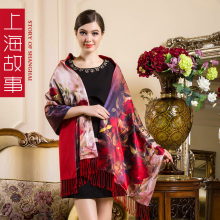 上海故事真丝丝巾秋冬长款双层加厚高档拉绒围巾桑蚕丝专柜披肩两