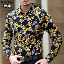 舞邦男装春秋金丝绒长袖印花衬衫个性烫金修身时尚衬衣潮爸爸装