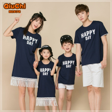 秋迟亲子装夏装2016一家三口全家装夏沙滩母女连衣裙短袖T恤套装