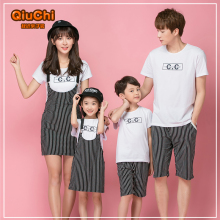 秋迟 亲子装套装 全家装 夏 一家三口夏装T恤两件套母女装背带裙