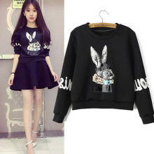 韩版秋冬女装圆领长袖加绒卫衣女可爱兔子印花套头学生短款上衣潮