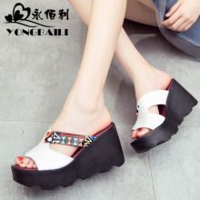 永佰利2017夏季新款时尚羊皮凉鞋女优雅坡跟真皮松糕水钻高跟女鞋