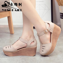 永佰利2017夏季新款镂空包头真皮凉鞋女 厚底坡跟舒适休闲女凉鞋
