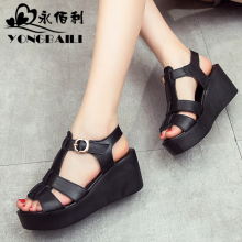 永佰利2017夏季新款百搭真皮高跟松糕凉鞋女厚底镂空鱼嘴休闲女鞋