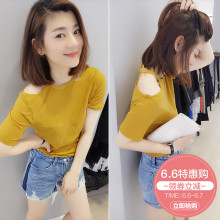欧洲站2017夏装新款女装欧货潮 时尚韩版心机上衣性感露肩短袖T恤