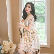 APHROO原创设计甜美短袖宽松小清新印花碎花木耳边蓬蓬雪纺连衣裙