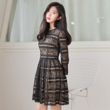 秋装新款名媛气质修身收腰显瘦百褶蓬蓬九分长袖镂空蕾丝连衣裙
