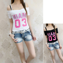 夜店女装夏季短袖 一字领 露肩 t恤 上衣短款体恤字母 露脐小衫潮