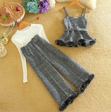 女装欧洲站潮时尚吊带女套装长袖打底衫荷叶边吊带阔腿裤兔毛皮草