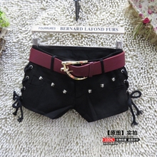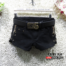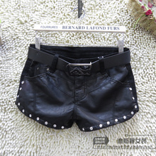 包邮2016秋冬新款黑色订珠PU皮短裤热裤女靴裤性感牛仔拼皮超短裤