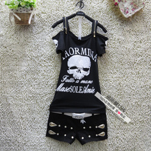 包邮夏女装T恤短袖 吊带拉链一字领露肩骷头印字母肩章非主流嘻哈