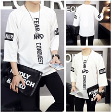 港风潮流韩版宽松七分袖T恤日系印花半袖体恤港仔短袖T恤男五分袖