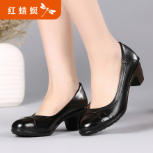 红蜻蜓真皮女鞋单鞋春秋新款正品时尚圆头套脚粗中跟职业女士皮鞋