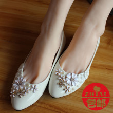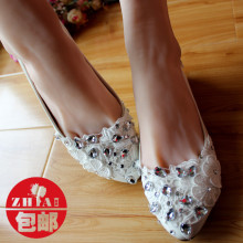 春季新款女单鞋 蕾丝花朵水钻平底婚鞋 新娘平跟鞋手工演出伴娘鞋