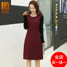 帝柔2017春装新款气质长袖中长款女装显瘦毛呢连衣裙修身打底裙