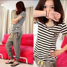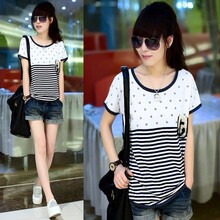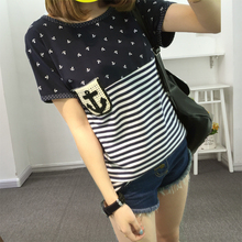 2016新品特大码女装夏装显瘦胖mm夏装韩版时尚徽章条纹短袖T恤