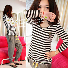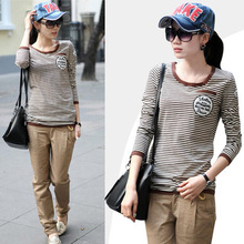 胖mm秋装2016大码女装新款韩版显瘦长袖t恤徽章条纹打底衫上衣潮