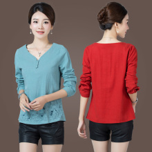长袖衬衫棉麻上衣T恤衫绣花休闲加大码中年女装妈妈装春秋装新款
