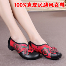 民族风真皮女鞋坡跟防滑圆头单鞋浅口绣花魔术贴中老年皮鞋妈妈鞋