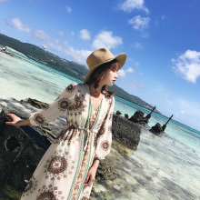 2017夏季新款波西米亚风7分袖度假印花长裙 绑带宽松V领裙子女潮