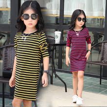 2017新款女童条纹长袖t恤纯棉中长款儿童打底衫女大童上衣春装潮