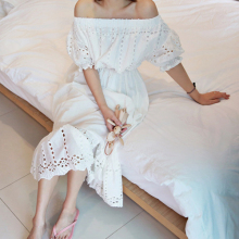 鬼鬼家 韩国代购 智慧之选 少女味道镂空雕花露肩一字领连衣裙