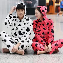 秋冬季加厚奶牛款法兰绒情侣睡衣男女士可爱卡通珊瑚绒家居服套装