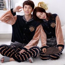 秋冬季情侣睡衣珊瑚绒睡衣女开衫无领大码男法兰绒家居服长袖套装