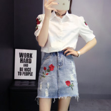 2017新款短袖衬衫刺绣牛仔半身裙两件套气质套装裙时尚套装女夏装