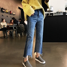 春装韩版侧条拼色牛仔裤女毛边阔腿九分裤宽松长裤休闲百搭裤子潮