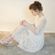 百合花 仙美清新V领中袖白色名媛气质显瘦a字裙春装蕾丝连衣裙夏