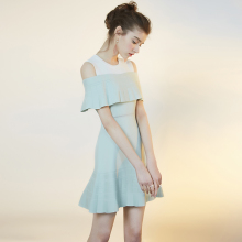 染心 荷叶边一字肩露肩a字裙子高腰修身收腰显瘦春针织连衣裙女夏
