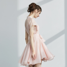 海棠粉 细腻有垂坠感 大裙摆收腰修身短袖雪纺连衣裙女夏a字裙子
