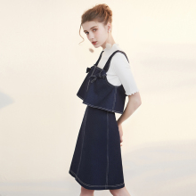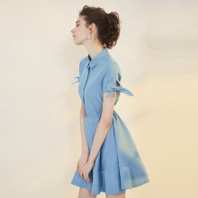 夜空精灵 大裙摆可调节松紧收腰 短袖蝴蝶结a字牛仔连衣裙衬衫裙