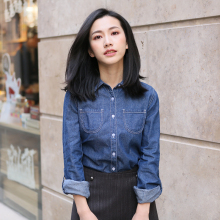Mshop 新款文艺小清新翻领口袋修身挽袖水洗牛仔衬衫上衣女