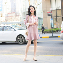 Mshop 荷叶袖冰麻针织裙2017春款新品蝴蝶结七分袖连衣裙短裙